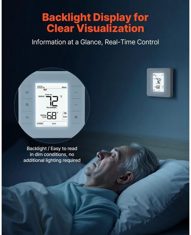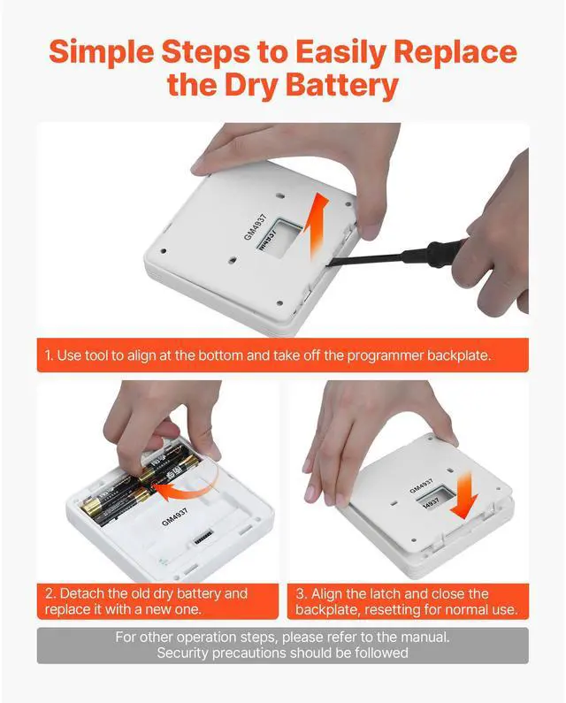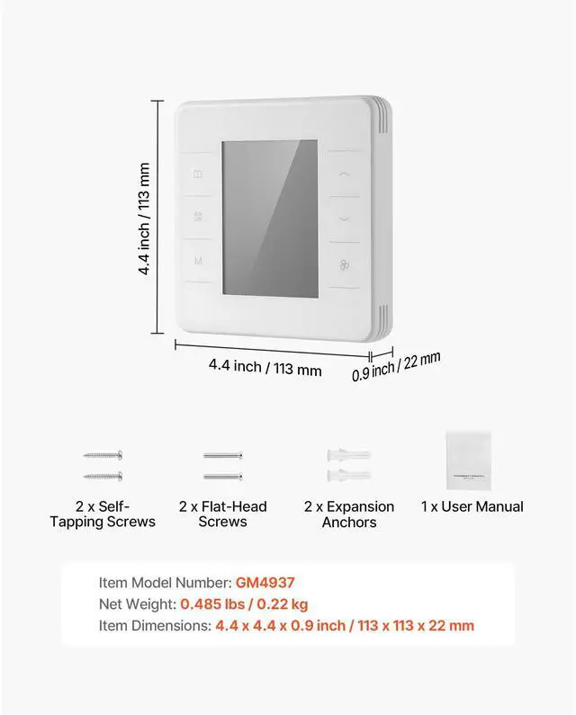 Modes: 1 Cooling & 1 Heating,Control Method: LCD + Touch Buttons with Backlight,Color: White,Item Model Number: GM4937,Temperature Range: 41-99 / 5-37,Item Dimensions: 6.4 x 6.3 x 1.9 inch / 163 x 160 x 48 mm,Programming Function: Yes, 7-Day Time Range,Net Weight: 0.485 lbs / 0.22 kg,LCD Display Module: HTN Positive Display, 2.95 VDC,Main Material: PC + ABS Flame-Retardant Material,Power Supply: DC24V/3V Dry Batteries