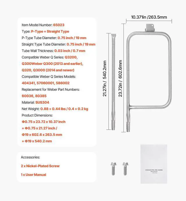 P-Type Tube Diameter: 0.75 inch / 19 mm,Type: P-Type + Straight Type,Tube Wall Thickness: 0.03 inch / 0.7 mm,Compatible Weber Q Series: Q3200, Q300(2013 and earlier), Q320, Q3000 (2014 and newer),Item Model Number: 65023,Straight Type Tube Diameter: 0.75 inch / 19 mm,Compatible Weber Q Series Models: 404341, 57060001, 586002,Material: SUS304,Product Dimensions: 0.75 x 23.72 x 10.37 inch + 0.75 x 21.27 inch / 19 x 602.6 x 263.5 mm + 19 x 540.2 mm,Net Weight: 0.88 + 0.44 lbs / 0.4 + 0.2 kg,Replacement for Weber Part Numbers: 60036, 80385
