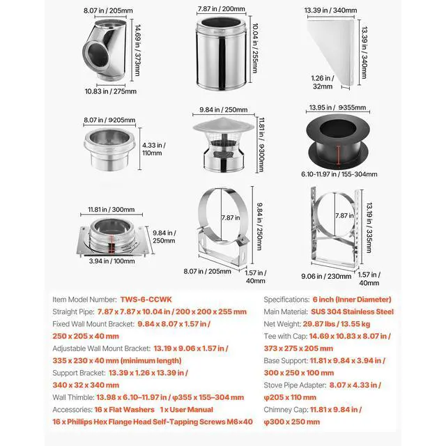 Specifications: 6 inch,Color: Silver,Straight Pipe: 7.87 x 7.87 x 10.04 in / 200 x 200 x 255 mm,Item Model Number: TWS-6-CCWK,Net Weight: 29.87 lbs / 13.55 kg,Fixed Wall Mount Bracket: 9.84 x 8.07 x 1.57 in / 250 x 205 x 40 mm,Main Material: SUS 304 Stainless Steel