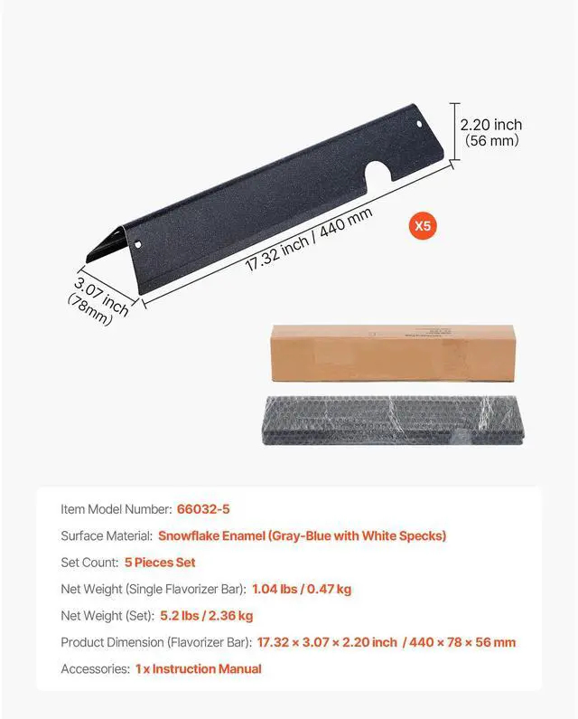 Item Model Number: 66032-5,Net Weight (Single Flavorizer Bar): 1.04 lbs / 0.47 kg,Product Dimension (Flavorizer Bar): 17.32 x 3.07 x 2.20 inch / 440 x 78 x 56 mm,Net Weight (Set): 5.2 lbs / 2.36 kg,Main Material: Porcelain Enameled Steel