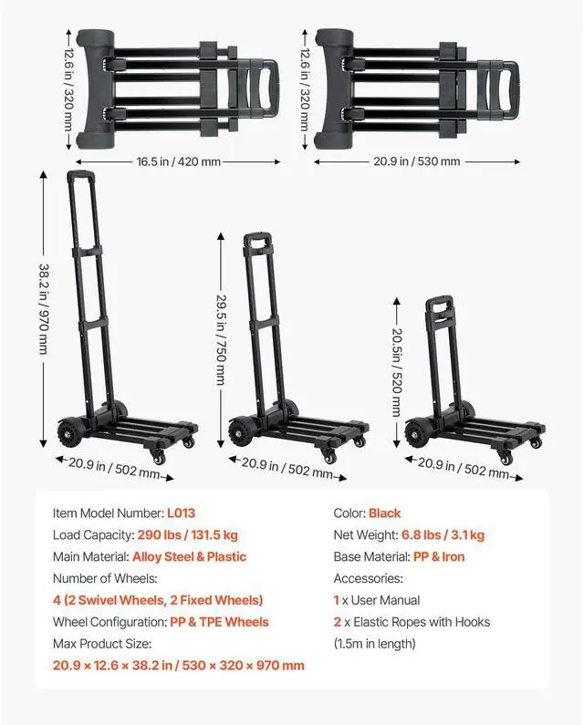 Load Capacity: 290 lbs / 131.5 kg,Color: Black,Item Model Number: L013,Wheel Configuration: PP & TPE Wheels,Max Product Size: 20.9 x 12.6 x 38.2 in / 530 x 320 x 970 mm,Number of Wheels: 4 (2 Swivel Wheels, 2 Fixed Wheels),Net Weight: 6.8 lbs / 3.1 kg,Main Material: Alloy Steel & Plastic,Base Material: PP & Iron