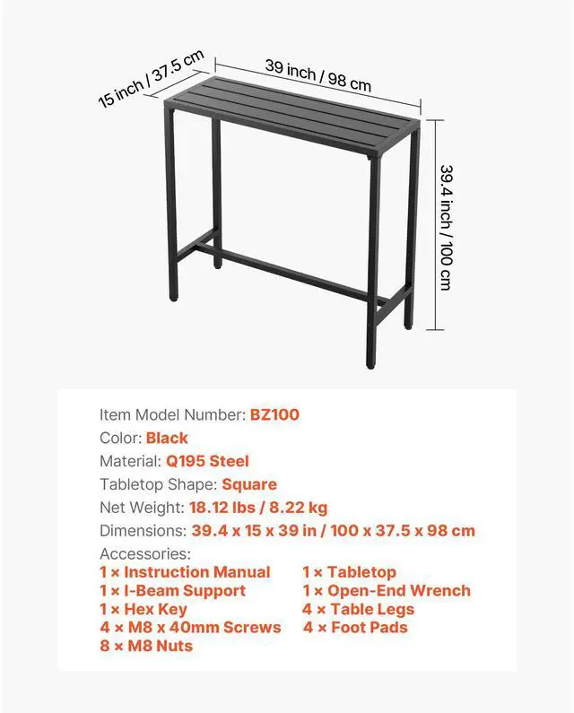 Tabletop Shape: Square,Color: Black,Item Model Number: BZ100,Dimensions: 39.4 x 15 x 39 in / 1000 x 375 x 980 mm,Material: Q195 Steel,Net Weight: 18.12 lbs / 8.22 kg