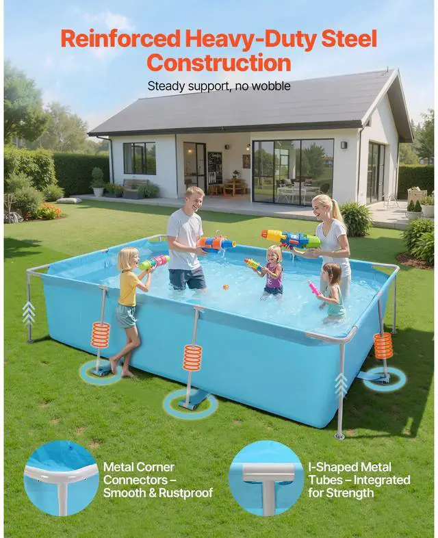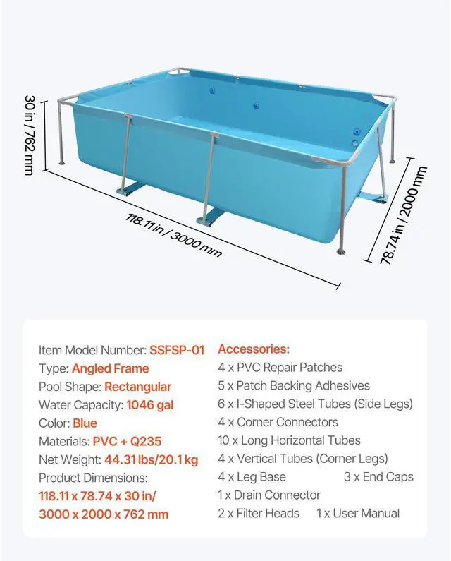 Type: Angled Frame,Water Capacity: 1046 gal,Color: Blue,Materials: PVC + Q235,Item Model Number: SSFSP-01,Product Dimensions: 118.11 x 78.74 x 30 in/3000 x 2000 x 762 mm,Pool Shape: Rectangular,Net Weight: 44.31 lbs/20.1 kg