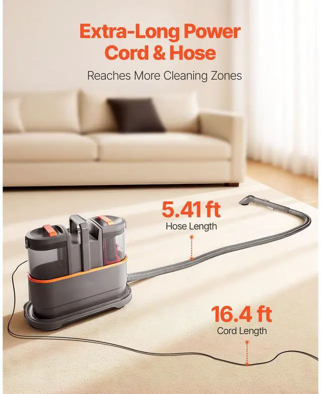 Noise Level: 84 dBA,Clean Water Tank Capacity: 50.72 oz / 1.5 L,Suction Power: 40 AW,Color: Dark Gray + Orange,Item Model Number: CX002C,Dirty Water Tank Capacity: 27.05 oz / 0.8 L,Material: PP + ABS + PVC + MABS,Item Dimensions: 15.16 x 7.48 x 12.91 inch / 385 x 190 x 328 mm,Vacuum Pressure: 11.5 KPa,Net Weight: 9.33 lbs / 4.23 kg,Power Supply: AC110V120V, 60Hz, 450W
