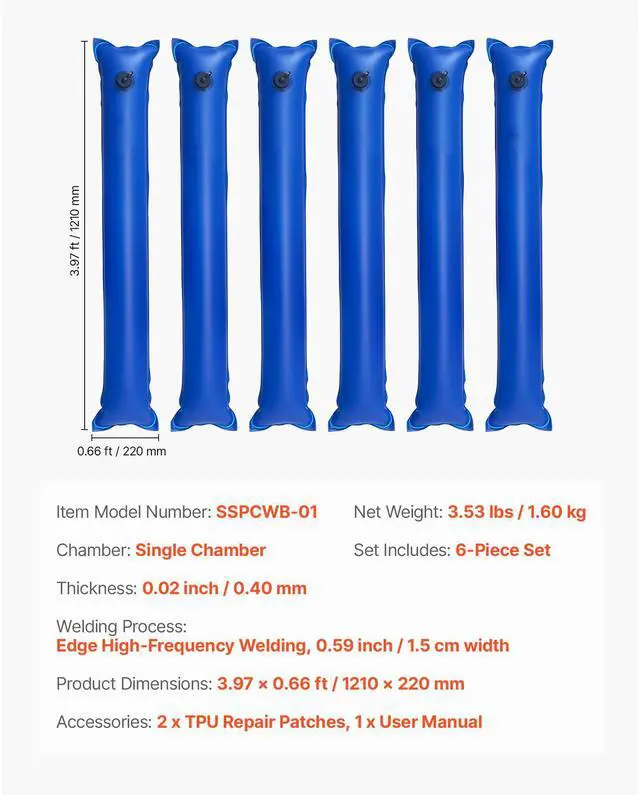 Thickness: 0.02 inch / 0.40 mm,Welding Process: Edge High-Frequency Welding, 0.59 inch / 1.5 cm width,Item Model Number: SSPCWB-01,Set Includes: 6-Piece Set,Product Dimensions: 47.63 x 7.87 inch/1210 x 220 mm,Chamber: Single Chamber,Net Weight: 3.53 lbs / 1.60 kg