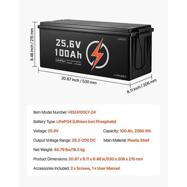 Capacity: 100 Ah, 2560 Wh,Voltage: 25.6V,Item Model Number: HD24100LY-24,Battery Type: LiFePO4 (Lithium Iron Phosphate),Output Voltage Range: 29.220V DC,Main Material: Plastic Shell