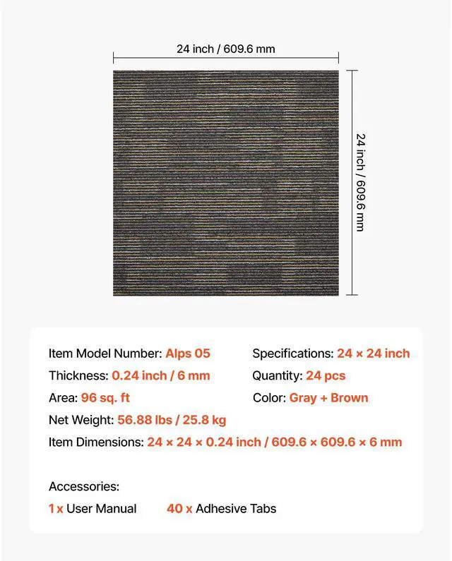 Thickness: 0.24 inch / 6 mm,Area: 96 sq. ft,Main Materials: Polypropylene and Asphalt,Specifications: 24 x 24 inch,Color: Gray + Brown,Item Model Number: Alps 05,Quantity: 24 pcs,Item Dimensions: 24 x 24 x 0.24 inch / 610 x 610 x 6 mm,Net Weight: 56.88 lbs / 25.8 kg