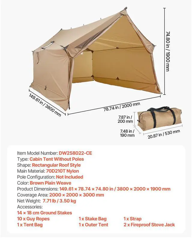 Type: Cabin Tent Without Poles,Shape: Rectangular Roof Style,Color: Brown Plain Weave,Item Model Number: DW258022-CE,Pole Configuration: Not Included,Coverage Area: 2 x 2 x 3 m,Product Dimensions: 3800 × 2000 × 1900 mm / 149.61 × 78.74 × 74.80 in,Net Weight: 3.50kg /7.71 lb,Main Material: 70D210T Nylon