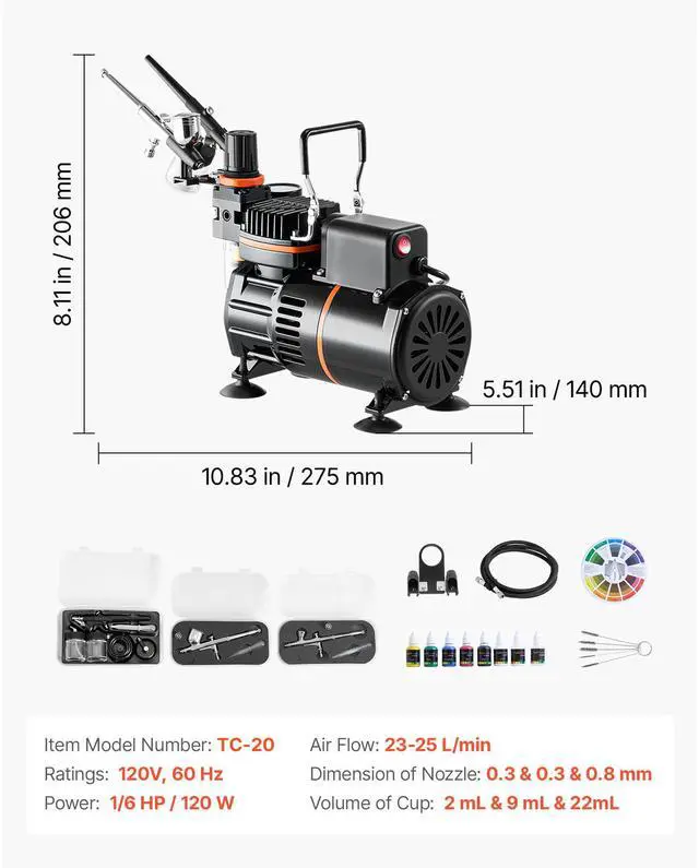 Air Flow: 23-25 L / min,Volume of Cup: 2 mL & 9 mL & 22mL,Voltage: 120V, 60 Hz,Item Model Number: TC-20,Dimension of Nozzle: 0.3 & 0.3 & 0.8 mm,Power: 1/6 HP / 120 W