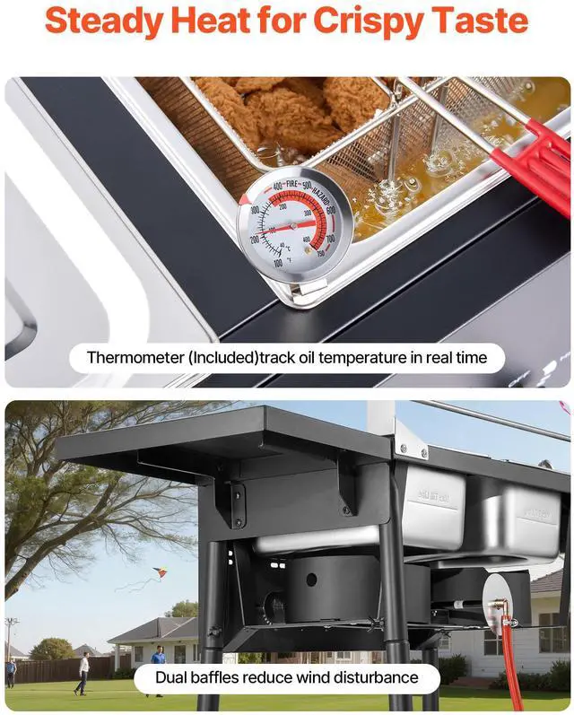 Fryer Size: 44.88x17.13x35.9 in / 1140x435x912 mm,Tank Size: 11.81x 9.45x5.51 in / 300x240x140 mm,Number of Burners: 2,Burner Heat Output: 40,000 BTU/HOUR (total),Heat Adjustment Method: Knob Adjustment,Basket Size: 8.66x7.48x5.12 in / 220x190x130 mm,Fuel Type: Propane,Tank Capacity: 16QT / 4 Gal (total),Main Materials: Stainless Steel / Nickel-Plated / Cast Iron,Item Model Number: DBFY01,Product Weight: 43.21 lb / 19.6 kg,Number of Fry Baskets: 2,Tube Length: 35.83 in / 910 mm