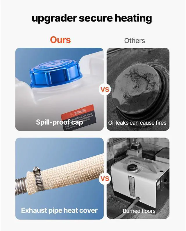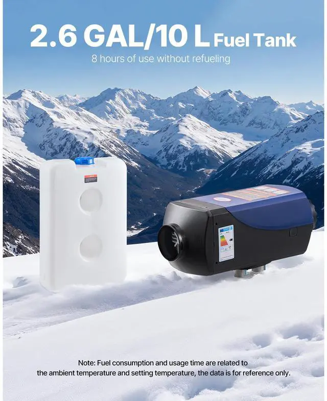 Fuel Consumption: 0.04 - 0.1 gal/h (0.170.48 L/h),Operating Noise: 75 dB,Temperature Adjustment Range: 46.496.8 / 836 (10-level adjustable),Item Model Number: XMZ-F-D6,Air-Fuel Ratio: 24004400 rpm, 2.06.1 Hz,Operating Altitude: Below 9842 ft / 3000 m,Fuel Tank Capacity: 2.6 GAL / 10 L,Overheat Protection: 536 / 280,Air Outlet Diameter: 2.9 inch / 75 mm,Combustion Efficiency: 90%,Product Dimensions: 14.9 x 5.5 x 6.9 inch / 380 x 140 x 175 mm,Net Weight: 12.1 lbs / 5.5 kg (including all accessories)