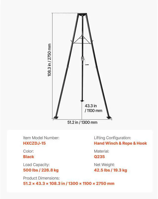 Load Capacity: 500 lbs / 226.8 kg,Color: Black,Item Model Number: HXCZDJ-15,Lifting Configuration: Hand Winch & Rope & Hook,Material: Q235,Product Dimensions: 51.2 x 43.3 x 108.3 in / 1300 x 1100 x 2750 mm,Net Weight: 42.5 lbs / 19.3 kg