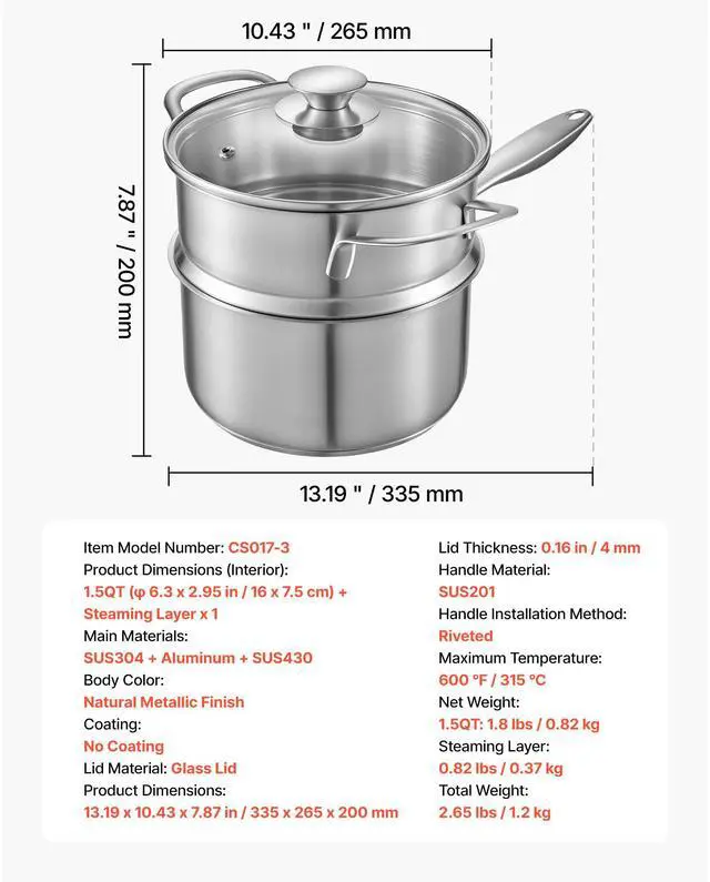 Product Dimensions (Interior): 1.5QT ( 6.3 x 2.95 in / 16 x 7.5 cm) + Steaming Layer x 1,Handle Installation Method: Riveted,Body Color: Natural Metallic Finish,Maximum Temperature: 600 / 315 ,Product Dimensions: 13.19 x 10.43 x 7.87 in / 335 x 265 x 200 mm,Total Weight: 2.65 lbs / 1.2 kg,Main Materials: SUS304 + Aluminum + SUS430,Steaming Layer: 0.82 lbs / 0.37 kg,Lid Material: Glass Lid, Thickness: 0.16 in / 4 mm,Item Model Number: CS017-3,Coating: No Coating,Net Weight: 1.5QT: 1.8 lbs / 0.82 kg,Handle Material: SUS201