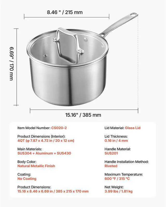 Product Dimensions (Interior): 4QT ( 7.87 x 4.72 in / 20 x 12 cm),Handle Installation Method: Riveted,Main Materials: SUS304 + Aluminum + SUS430,Lid Material: Glass Lid, Thickness: 0.16 in / 4 mm,Body Color: Natural Metallic Finish,Item Model Number: CS020-2,Coating: No Coating,Maximum Temperature: 600 / 315 ,Product Dimensions: 15.16 x 8.46 x 6.69 in / 385 x 215 x 170 mm,Net Weight: 3.99 lbs / 1.81 kg,Handle Material: SUS201