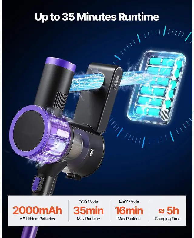 Noise Level: 78 dB,Runtime: High Mode: Approx. 16 min; Low Mode: Approx. 35 min,Main Materials: ABS + Iron Tube,Item Dimensions (L x W x H): 46.46 x 9.65 x 8.66 in / 1180 x 245 x 220 mm,Vacuum Suction: 15 to 25 kPa,Dust Cup Capacity: 0.8 L,Item Model Number: W01,Charging Time: Approx. 5 hours,Battery Type: 22.2V, 2000mAh Lithium Batteries x 6,Net Weight: 5.4 lbs / 2.45 kg,Speed Modes: 2