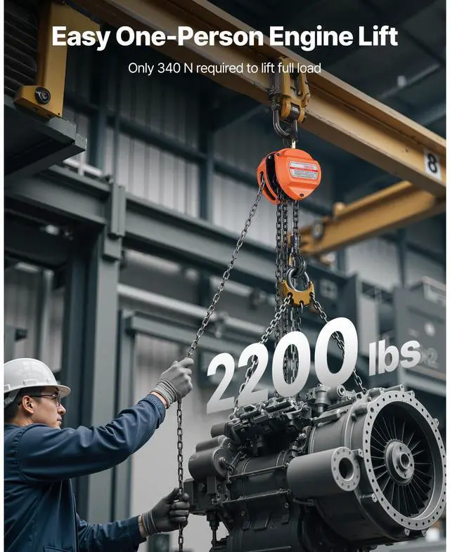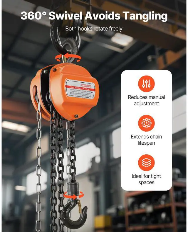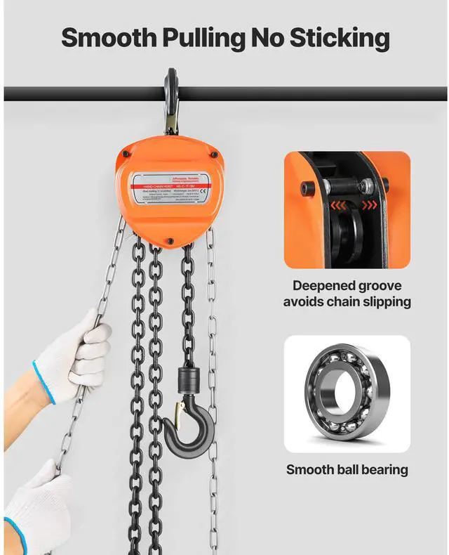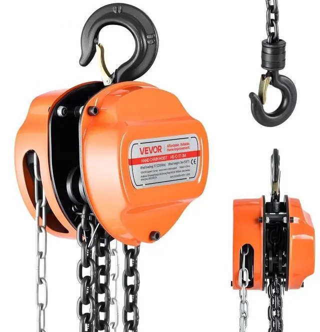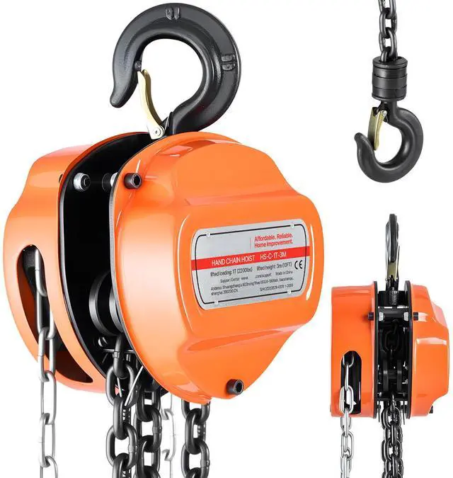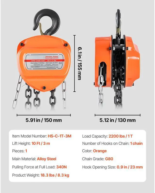 Number of Hooks on Chain: 1 chain,Hook Opening Size: 0.9 in / 23 mm,Load Capacity: 2200 lbs / 1 T,Color: Orange,Item Model Number: HS-C-1T-3M,Chain Grade: G80,Lift Height: 10 Ft / 3 m,Product Dimensions: 5.12 x 5.91 x 6.10 in / 130 x 150 x 155 mm (excluding hook and chain),Main Material: Alloy Steel,Pulling Force at Full Load: 340N,Pieces: 1