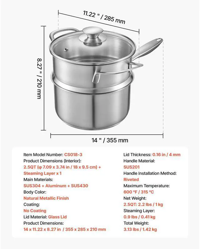 Product Dimensions (Interior): 2.5QT ( 7.09 x 3.74 in / 18 x 9.5 cm) + Steaming Layer x 1,Handle Installation Method: Riveted,Body Color: Natural Metallic Finish,Maximum Temperature: 600 / 315 ,Product Dimensions: 14 x 11.22 x 8.27 in / 355 x 285 x 210 mm,Total Weight: 3.13 lbs / 1.42 kg,Main Materials: SUS304 + Aluminum + SUS430,Steaming Layer: 0.9 lbs / 0.41 kg,Lid Material: Glass Lid, Thickness: 0.16 in / 4 mm,Item Model Number: CS018-3,Coating: No Coating,Net Weight: 2.5QT: 2.2 lbs / 1 kg,Handle Material: SUS201