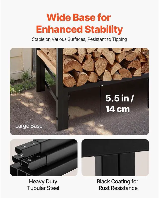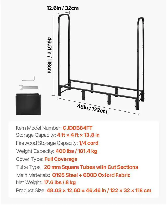 Tube Type: 20 mm Square Tubes with Cut Sections,Main Materials: Q195 Steel + 600D Oxford Fabric,Item Model Number: CJDDB84FT,Firewood Storage Capacity: 1/4 cord,Weight Capacity400 lbs / 181.4 kg:,Storage Capacity: 4 ft × 4 ft × 13.8 in,Cover Type: Full Coverage,Product Dimensions: 48.03 × 12.60 × 46.46 in / 1220 × 320 × 1180 mm,Net Weight: 17.6 lbs / 8 kg