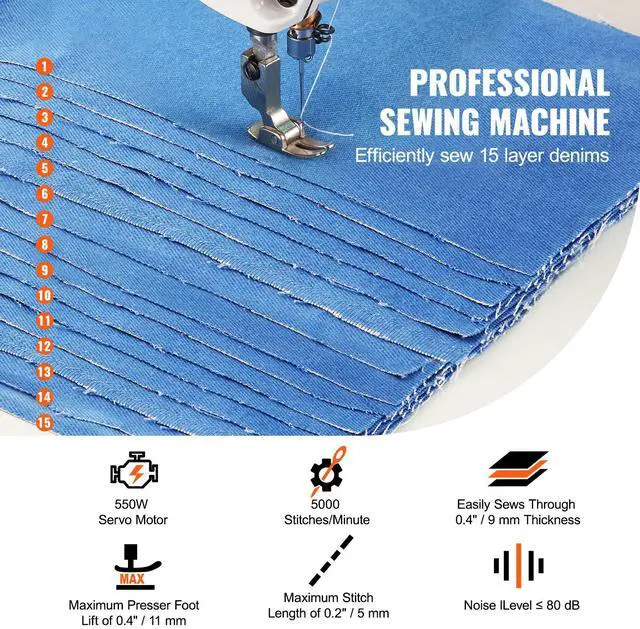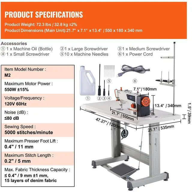 Maximum Stitch Length: 0.2" / 5 mm,Voltage/Frequency: 120V 60Hz,Max. Fabric Thickness Capacity: 0.4" / 9 mm ±1 mm, 15 layers of denim fabric,Item Model Number: M2,Sewing Speed: 5000 stitches/minute,Product Weight: 72.3 lbs / 32.8 kg ±2%,Maximum Presser Foot Lift: 0.4" / 11 mm,Noise (dB): 80 dB,Product Dimensions (Main Unit): 21.7" x 7.1" x 13.4" / 550 x 180 x 340 mm,Maximum Motor Power: 550W ±15%