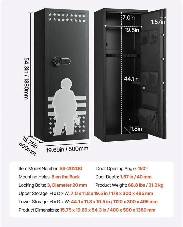 Mounting Holes: 6 on the Back,Locking Bolts: 3, Diameter 20 mm,Lower Storage: H x D x W: 44.1 x 11.8 x 19.5 in / 1120 x 300 x 495 mm,Upper Storage: H x D x W: 7.0 x 11.8 x 19.5 in / 178 x 300 x 495 mm,Door Opening Angle: 150°,Item Model Number: SS-202QG,Product Weight: 68.8 lbs / 31.2 kg,Product Dimensions: 15.75 x 19.69 x 54.3 in / 400 x 500 x 1380 mm,Door Depth: 1.57 in / 40 mm
