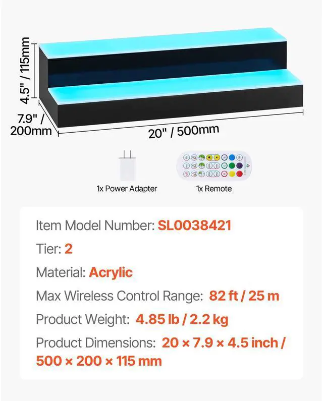 Item Model Number: SL0038421,Bottle Capacity: 10,Product Weight: 4.85 lb / 2.2 kg,Material: Acrylic,Item Dimensions: 20 x 7.9 x 4.5 inch / 500 x 200 x 115 mm,Max Wireless Control Range: 82 ft / 25 m,Number of Tier: 2
