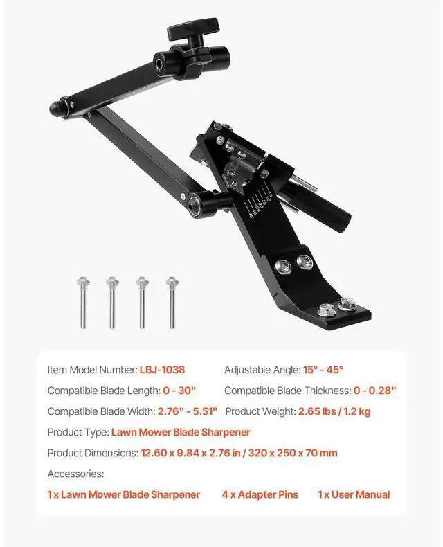 Product Type: Lawn Mower Blade Sharpener ,Compatible Blade Length: 0 - 30",Item Model Number: LBJ-1038,Product Weight: 2.65 lbs / 1.2 kg,Compatible Blade Thickness: 0 - 0.28",Product Dimensions: 12.60 x 9.84 x 2.76 in / 320 x 250 x 70 mm,Adjustable Angle: 15° - 45°,Compatible Blade Width: 2.76" - 5.51"
