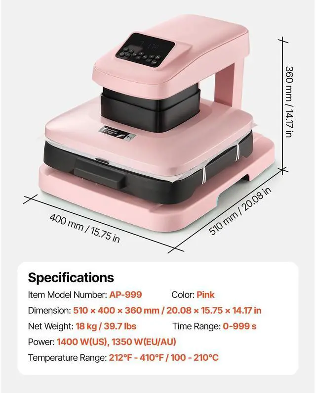Time Range: 0-999 s,Color: Pink,Item Model Number: AP-999,Temperature Range: 32°F - 410°F / 0 - 210°C,Dimension: 510 x 400 x 360 mm / 20.08 x 15.75 x 14.17 in,Net Weight: 18 kg / 39.7 lbs,Power: 1400 W(US), 1350 W(EU)
