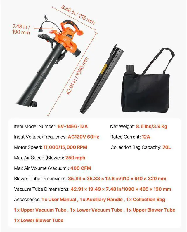 Motor Speed: 11,000/15,000 RPM,Max Air Volume (Vacuum): 53.27 CFM (13 m³/min),Collection Bag Capacity: 70L,Item Model Number: BV-14EG-12A,Vacuum Tube Dimensions: 42.91 x 19.49 x 7.48 in/1090 x 495 x 190 mm,Rated Current: 12A,Input Voltage/Frequency: AC120V 60Hz,Net Weight: 8.6 lbs/3.9 kg,Blower Tube Dimensions: 35.83 x 35.83 x 12.6 in/910 x 910 x 320 mm,Max Air Speed (Blower): 217.35 mph (350 km/h)