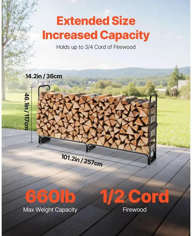 Tube Type: 25 mm Round Tubes,Item Model Number: CJODB88FT,Firewood Storage Capacity:1/2 cord,Material: Q195 Steel + 600D Oxford Fabric,Storage Capacity: 8 ft × 4 ft × 13.8 in,Cover Type: Full-Cover Design,Weight Capacity660 lbs / 299.4 kg:,Product Dimensions: 10.12 × 14.17 × 46.06 in / 2570 × 360 × 1170 mm,Net Weight: 28.7 lbs / 13 kg