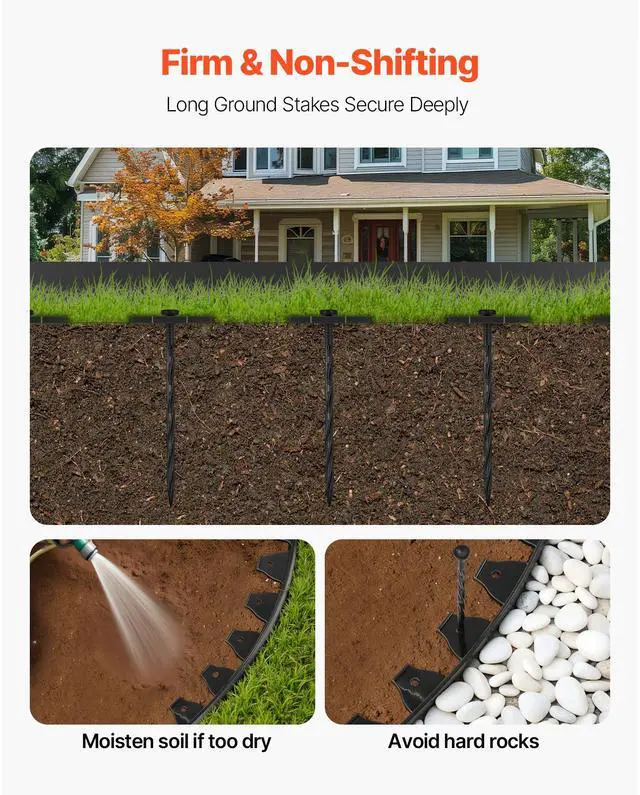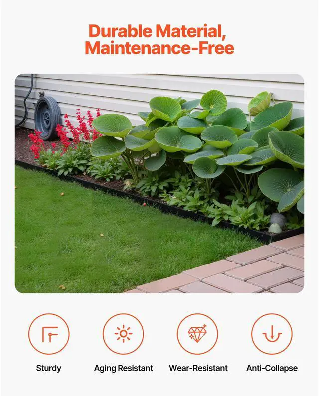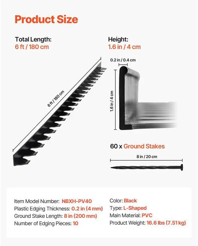 Plastic Edging Dimensions: 6 ft × 1.6 in (180 × 4 cm),Type: L-Shaped,Number of Edging Pieces: 10,Color: Black,Item Model Number: NBXH-PV40,Product Weight: 16.6 lbs (7.51 kg),Ground Stake Length: 8 in (200 mm),Plastic Edging Thickness: 0.2 in (4 mm),Main Material: PVC