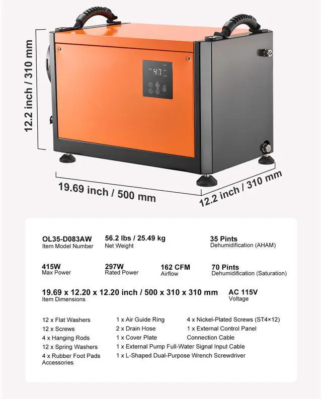 Airflow: 162 CFM,Max Power: 415W,Voltage: AC 115V,Item Model Number: OL35-D083AW,Dehumidification (Saturation): 70 Pints,Frequency: 60Hz,Rated Power: 297W,Material: Q235 Galvanized Steel,Item Dimensions: 19.69 x 12.20 x 12.20 inch / 500 x 310 x 310 mm,Dehumidification (AHAM): 35 Pints,Net Weight: 56.55 lbs / 25.65 kg