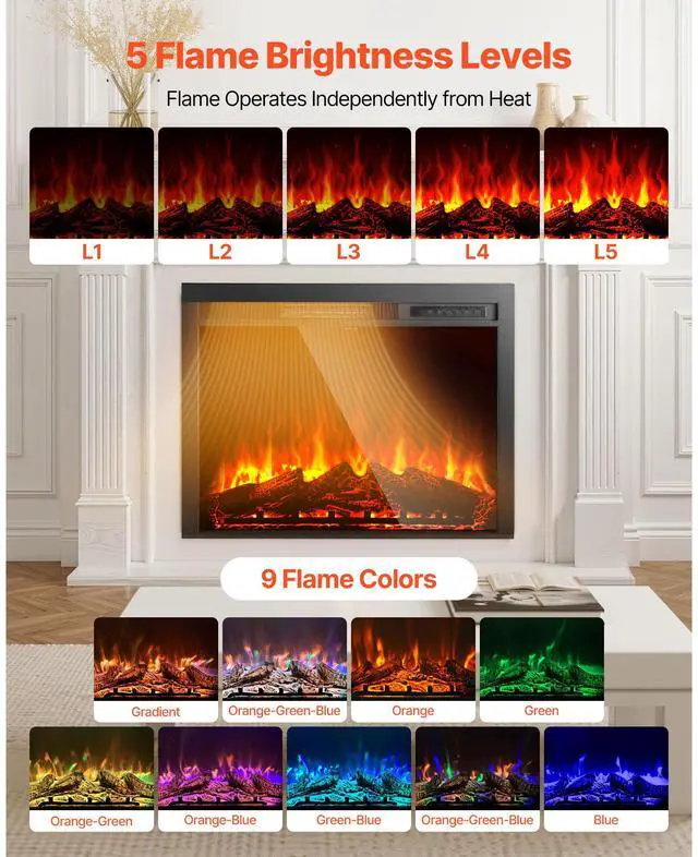 VEVOR 35in Electric Fireplace Insert Wall Recessed Heater 750W 1500W Remote