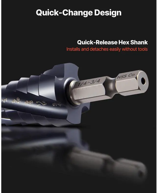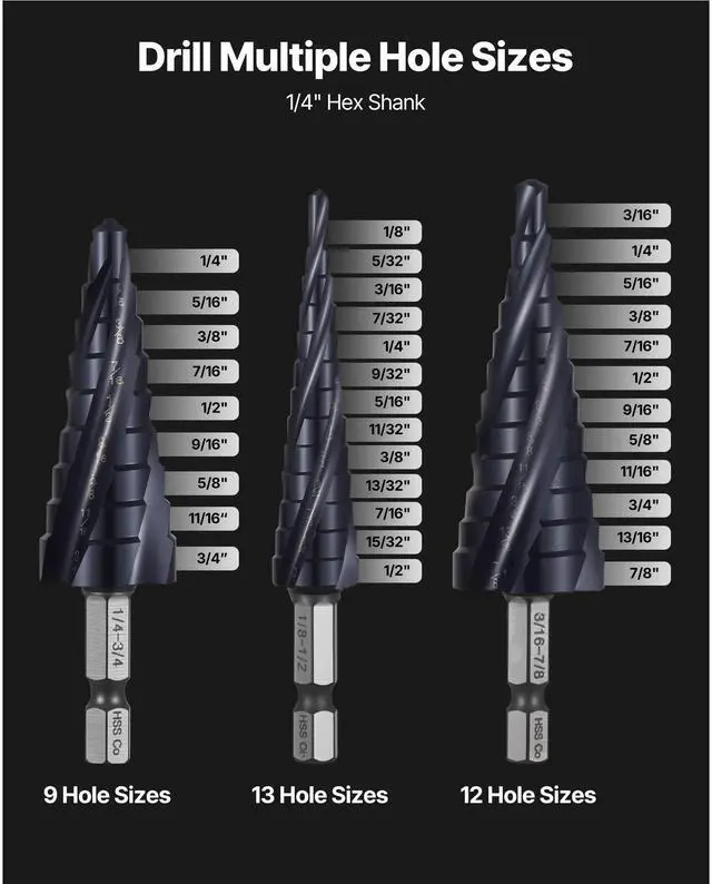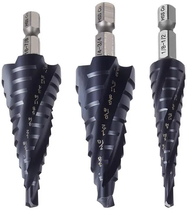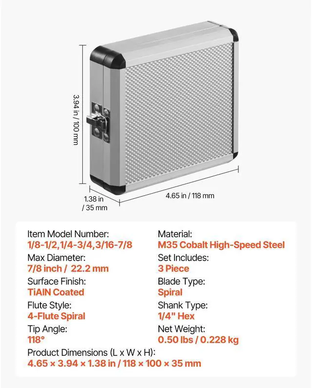 Blade Type: Spiral,Tip Angle: 118°,Item Model Number: 1/8-1/2,1/4-3/4,3/16-7/8,Material: M35 Cobalt High-Speed Steel,Set Includes: 3 Pieces,Surface Finish: TiAlN Coated,Product Dimensions (L x W x H): 4.65 x 3.94 x 1.38 in / 118 x 100 x 35 mm,Max Diameter: 7/8 inch / 22.2 mm,Shank Type: 1/4" Hex,Flute Style: 4-Flute Spiral,Net Weight: 0.50 lbs / 0.228 kg