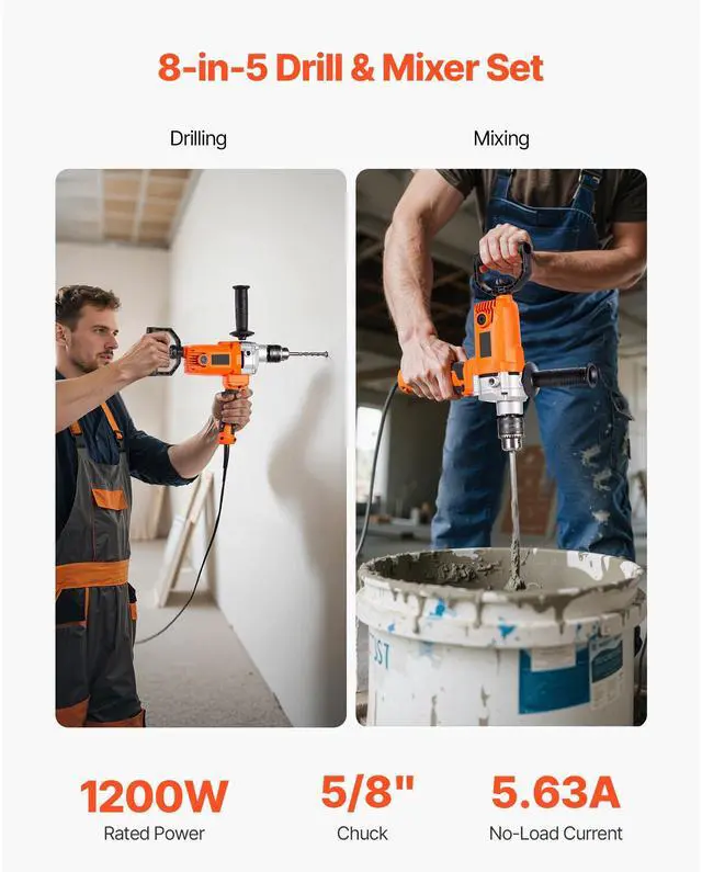 VEVOR Drill Mixer 1200W 0-750RPM Corded Electric Drill Mixers Set Concrete Mixer