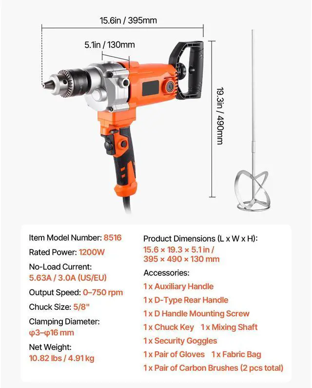 Chuck Size: 5/8",Output Speed: 0750 rpm,Clamping Diameter: 316 mm,No-Load Current: 5.63A / 3.0A (US/EU),Item Model Number: 8516,Rated Power: 1200W,Product Dimensions (L x W x H): 15.6 x 19.3 x 5.1 in / 395 x 490 x 130 mm,Net Weight: 10.82 lbs / 4.91 kg