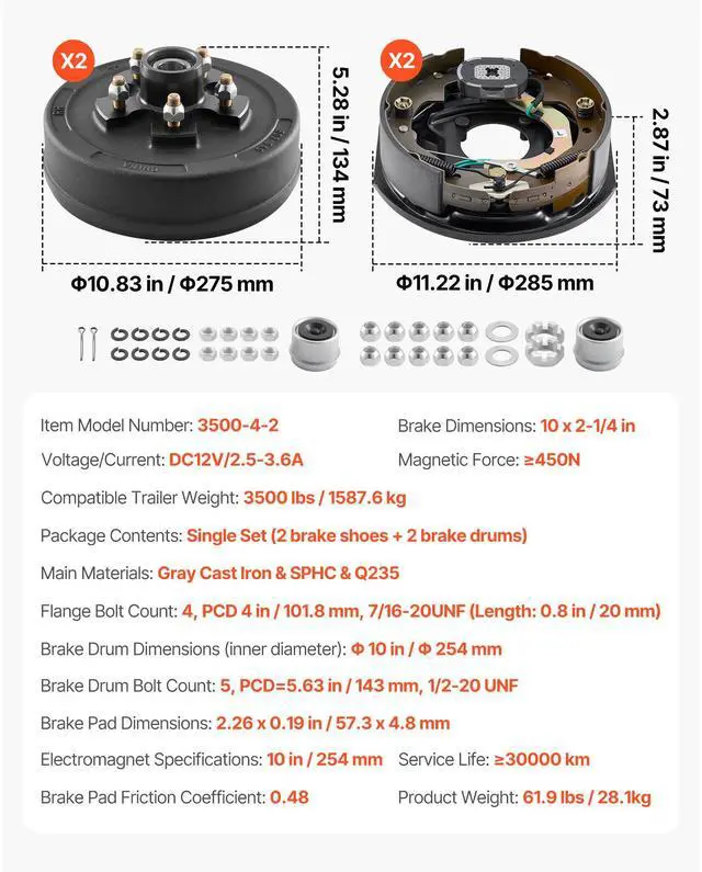 Electromagnet Specifications: 10 in / 254 mm,Brake Pad Dimensions: 2.26 x 0.19 in / 57.3 x 4.8 mm,Product Dimensions (Outer diameter × Height):,Compatible Trailer Weight: 3500 lbs / 1587.6 kg,Brake Pad Friction Coefficient: 0.48,Brake Drum: 10.83 x 5.28 in / 275 x 134 mm,Brake Dimensions: 10 x 2-1/4 inch,Magnetic Force: 450N,Brake Drum Dimensions (inner diameter): 10 in / 254 mm,Flange Bolt Count: 4, PCD 4 in / 101.8 mm, 7/16-20UNF (Length: 0.8 in / 20 mm),Service Life: 30000 km,Package Contents: Single Set (2 brake shoes + 2 brake drums),Main Materials: Gray Cast Iron & SPHC & Q235,Brake Drum Bolt Count: 5, PCD=5.63 in / 143 mm, 1/2-20 UNF,Item Model Number: 3500-4-2,Product Weight: 61.9 lbs / 28.1kg,Brake Shoe: 11.22 x 2.87 in / 285 x 73 mm,Voltage/Current: DC12V/2.5-3.6A