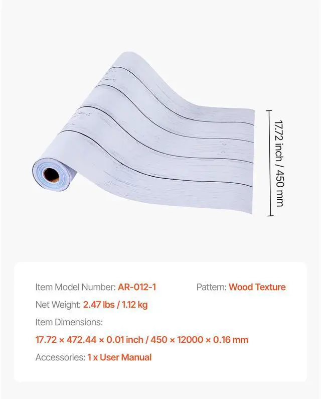 Pattern: Wood Texture,Roll Size (W x L): 17.72 x 472.44 inch / 45cm x 12m,Color: White,Item Model Number: AR-012-1,Item Dimensions: 17.72 x 472.44 x 0.01 inch / 450 x 12000 x 0.16 mm,Net Weight: 2.47 lbs / 1.12 kg,Main Material: PVC