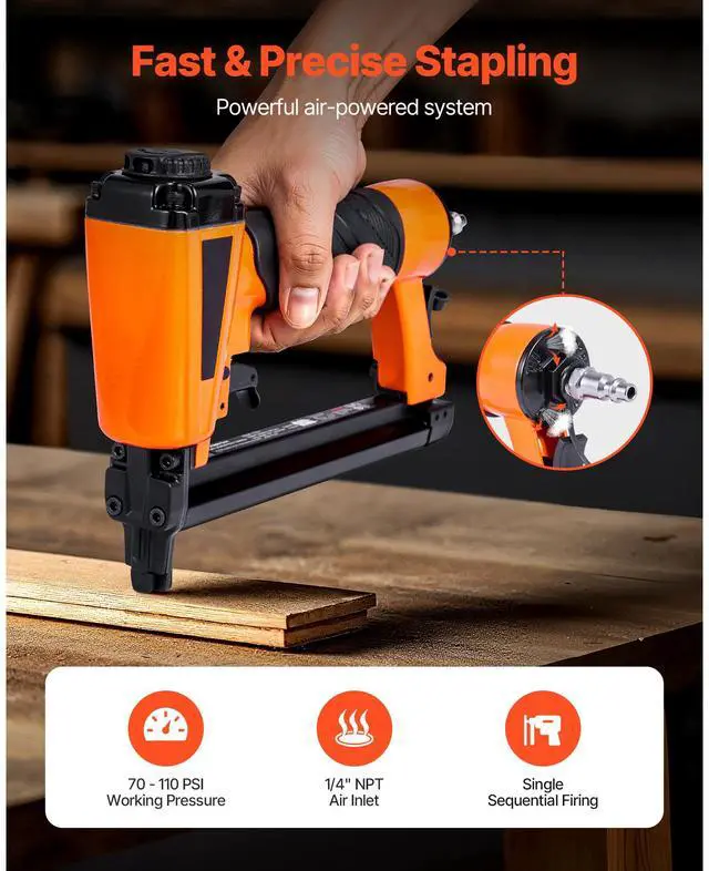Operating Pressure: 70 - 110 PSI,Staple Gun Type: 20-Gauge,Compatible Staple Length: 5/32 - 5/8 inch,Magazine Capacity: Max 100PCS,Item Model Number: VT50J,Compatible Crown Width: 7/16 inch,Air Inlet Size: 1/4" NPT,Compatible Staples: 20 Gauge T50 Staples,Product Dimensions: 9.84 x 2.05 x 6.89 inch / 250 x 52 x 175 mm,Net Weight: 2.2 lbs / 1 kg,Main Material: Aluminum Alloy