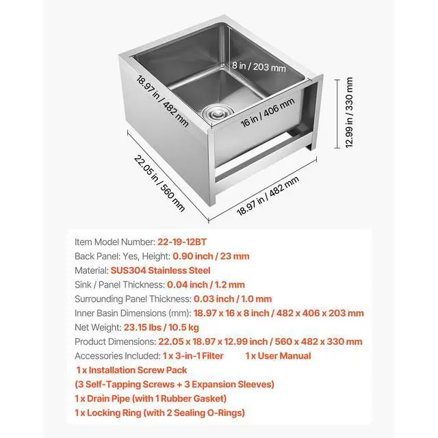 Back Panel Height: 0.90 inch / 23 mm,Sink / Panel Thickness: 0.04 inch / 1.2 mm,Back Panel Thickness: 0.04 inch / 1.2 mm,Item Model Number: 22-19-12BT,Material: SUS304 Stainless Steel,Surrounding Panel Thickness: 0.03 inch / 1.0 mm,Product Dimensions: 22.05 x 18.97 x 12.99 inch / 560 x 482 x 330 mm,Net Weight: 23.15 lbs / 10.5 kg,Inner Basin Dimensions (mm): 18.97 x 16 x 8 inch / 482 x 406 x 203 mm