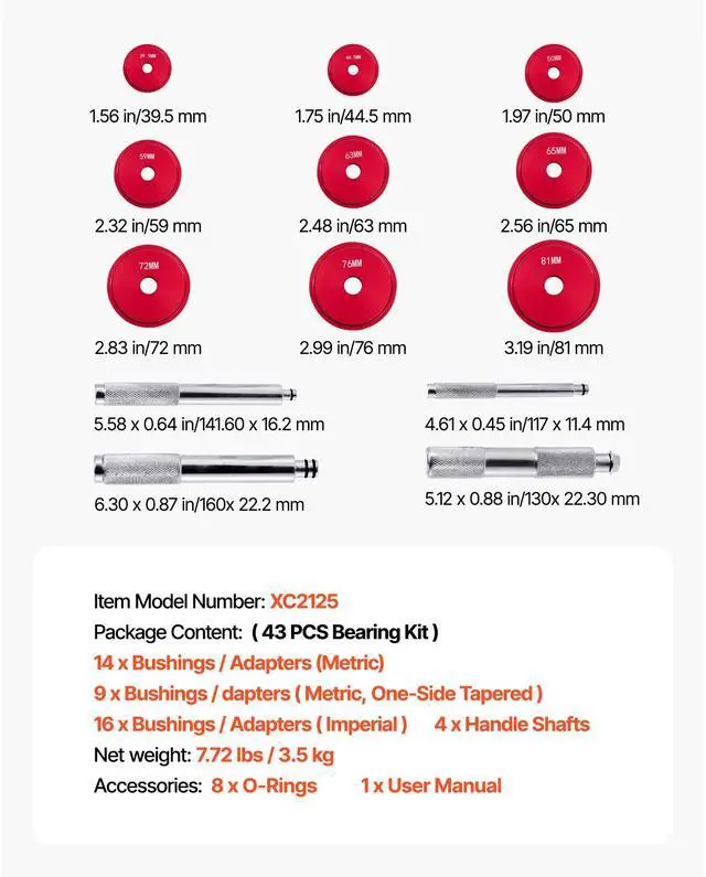 VEVOR Bearing Press Kit Bushing Bearing Seal Driver Removal Tool Set 43 Pcs Case Bearing Kit Versatile Sizes Premium Material Reliable Operation Multi-Purpose Application Easy to Carry Item Model Number: XC2125,Net Weight: 7.72 lbs/3.5 kg