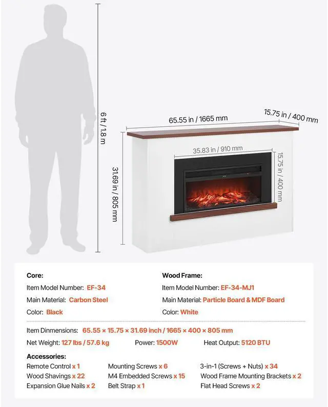 Installation Type: Freestanding,Color: Core: Black & Wood Frame: White,Item Model Number: Core IF-34, Wood Frame IF-34-MJ1,Wood Frame Dimensions: 65.55 x 15.75 x 31.69 in / 1665 x 400 x 805 mm,Material: Wood Frame: Particle Board & MDF Board, Core Housing: Q235A,Net Weight: 21.38 lbs / 9.7 kg,Power: 1500W,Heat Output: 5120BTU,Core Dimensions: 35.83 x 15.75 x 8.27 in / 910 x 400 x 210 mm,Power Supply: Wired