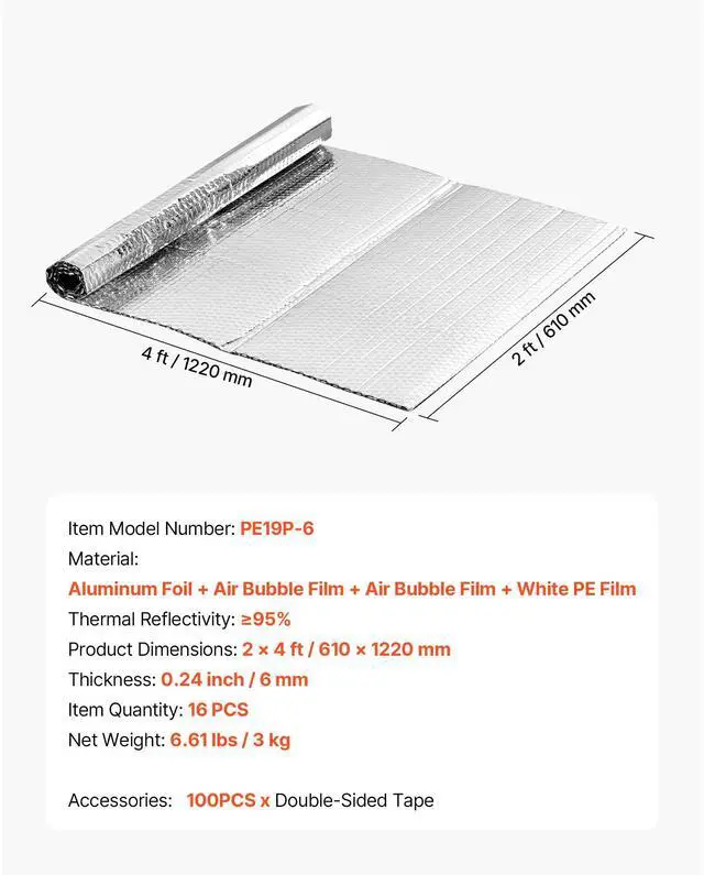 Thickness: 0.24 inch / 6 mm,Thermal Reflectivity: 95%,Item Quantity: 16PCS,Item Model Number: PE19P-6,Material: Aluminum Foil + Air Bubble Film + Air Bubble Film + Aluminum Foil,Product Dimensions: 2 x 4 ft / 610 x 1220 mm,Net Weight: 6.61 lbs / 3 kg