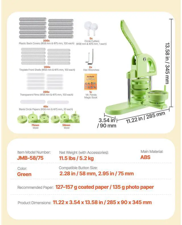 Recommended Paper: 127157 g coated paper / 135 g photo paper,Color: Green,Item Model Number: JMB-58/75,Net Weight (with Accessories): 11.5 lbs / 5.2 kg,Product Dimensions: 11.22 x 3.54 x 13.58 in / 285 x 90 x 345 mm,Compatible Button Sizes: 2.28 in / 58 mm, 2.95 in / 75 mm,Main Material: ABS