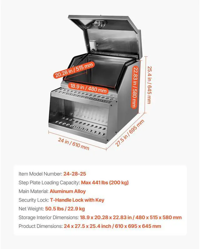 Security Lock: T-Handle Lock with Key,Storage Interior Dimensions: 18.9 x 20.28 x 22.83 in / 480 x 515 x 580 mm,Item Model Number: 24-28-25,Step Plate Load Capacity: Max 441 lbs (200 kg),Product Dimensions: 24 x 27.5 x 25.4 inch / 610 x 695 x 645 mm,Net Weight: 50.5 lbs / 22.9 kg,Main Material: Aluminum Alloy