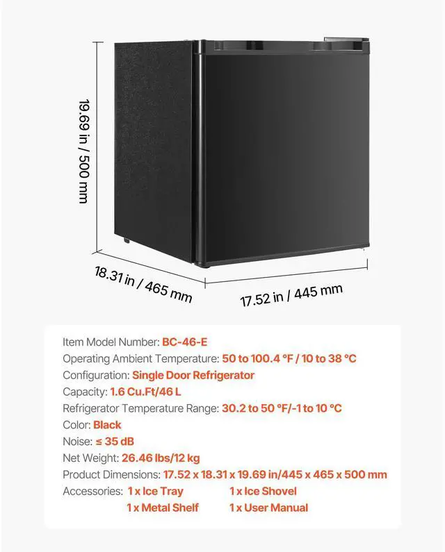Configuration: Single Door Refrigerator,Capacity: 1.6 Cu.Ft/46 L,Noise: 35 dB (tested at 1 meter in 20 dB ambient),Refrigerator Temperature Range: 30.2 to 50 /-1 to 10 ,Color: Black,Item Model Number: BC-46-E,Operating Ambient Temperature: 50 to 100.4 /10 to 38