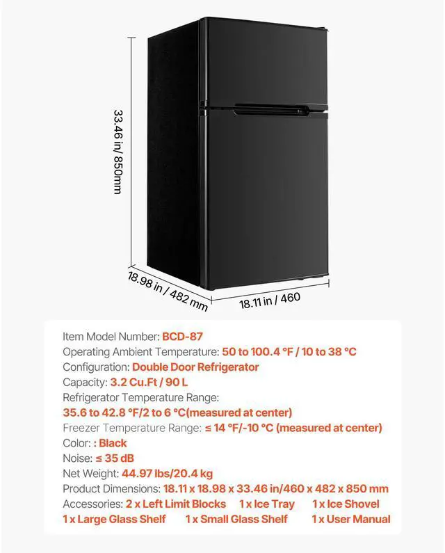 Freezer Temperature Range: 14 /-10 (measured at center),Configuration: Double Door Refrigerator,Capacity: 3.2 Cu.Ft/90 L,Noise: 35 dB,Refrigerator Temperature Range: 35.6 to 42.8 /2 to 6 (measured at center),Color: Black,Item Model Number: BCD-87,Operating Ambient Temperature: 50 to 100.4 /10 to 38