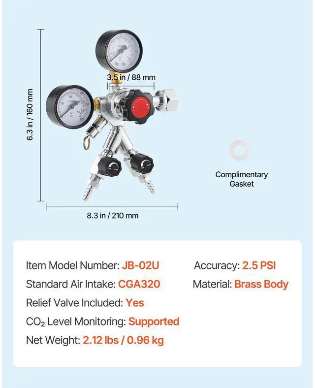 Accuracy: 2.5PSI,Standard Air Intake: CGA320,Relief Pressure Range: 5060 PSI,Item Model Number: JB-02U,Material: Brass Body,Item Dimensions: 6.3 x 8.3 x 3.5 in / 160 x 210 x 88 mm,Pressure Adjustment Range: 060 PSI,CO2 Level Monitoring: Supported,Net Weight: 2.12 lbs / 0.96 kg,Relief Valve Included: Yes