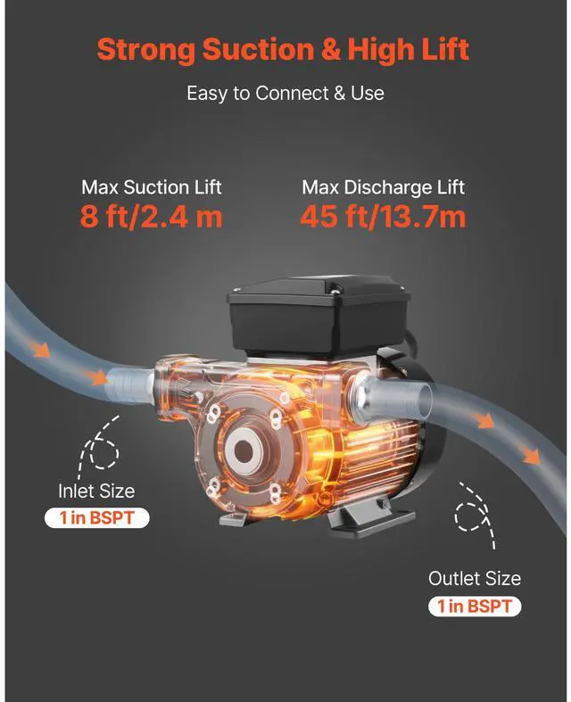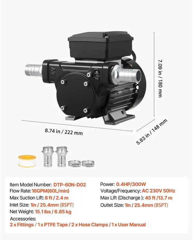 Flow Rate: 16 GPM/60 L/min,Voltage/Frequency: AC 110120V, 60Hz,Item Model Number: DTP-60N-D01,Max Lift (Discharge): 45 ft/13.7 m,Power: 0.5 HP/370 W,Max Suction Lift: 8 ft/2.4 m