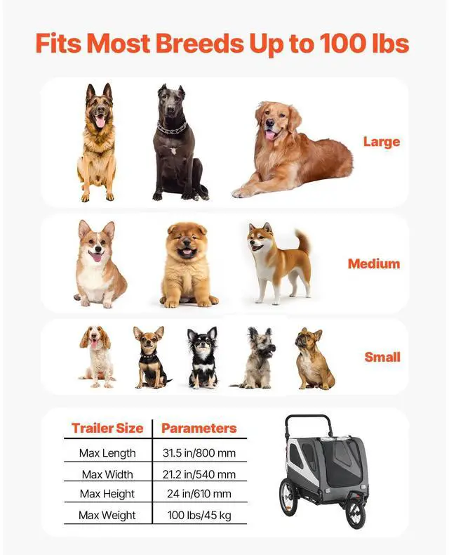 Product Dimensions (Stroller Mode): 54.3 x 30.3 x 33.3 in/1380 x 770 x 845 mm,Product Dimensions (Trailer Mode): 54.7 x 30.3 x 33.3 in/1390 x 770 x 845 mm,Pet Cabin Dimensions: 31.5 x 21.2 x 24 in/800 x 540 x 610 mm,Main Materials: Carbon Steel + 600D Oxford Fabric + PP,Compatible Bike Wheel Size: 22-28 in,Item Model Number: PTS22SJ,Maximum Load Capacity: 100 lbs/45 kg,Product Dimensions (Folded): 30.7 x 24.2 x 9.4 in/780 x 615 x 240 mm,Net Weight: 32.2 lbs/14.6 kg