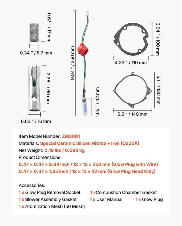 Materials: Special Ceramic Silicon Nitride + Iron (Q235A),0.47 x 0.47 x 9.84 inch / 12 x 12 x 250 mm (Glow Plug with Wire):,Item Model Number: ZM3001,Product Dimensions: ,Net Weight: 0.19 lbs / 0.086 kg,0.47 x 0.47 x 1.65 inch / 12 x 12 x 42 mm (Glow Plug Head Only):